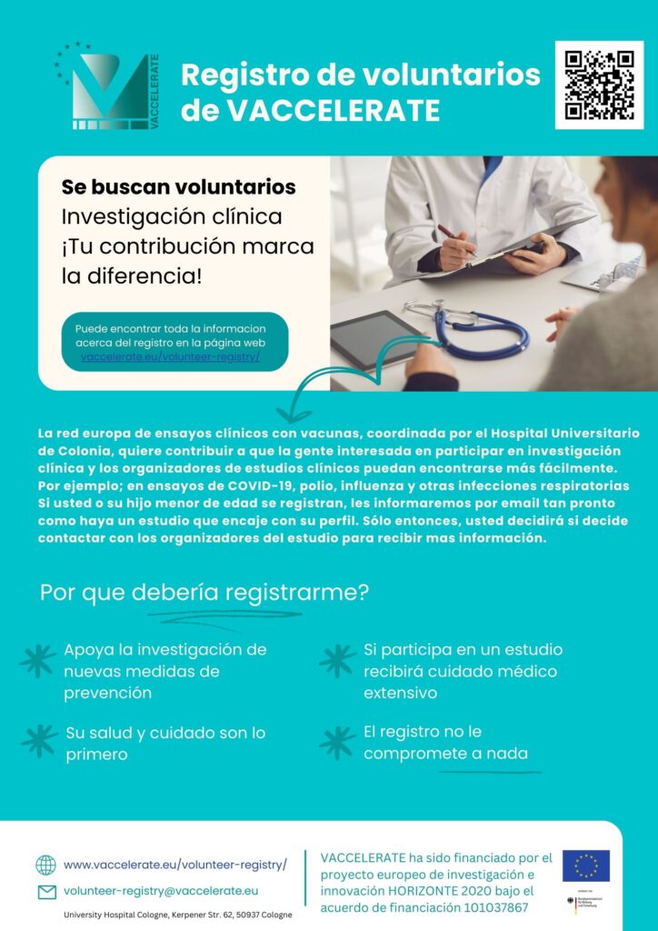 VACCELERATE ha recibido financiación del programa de investigación e innovación Horizonte 2020 de la Unión Europea en virtud del acuerdo de subvención nº 101037867. El Registro Alemán de Voluntarios fue financiado por el BMBF (Bundesministerium für Bildung und Forschung).
